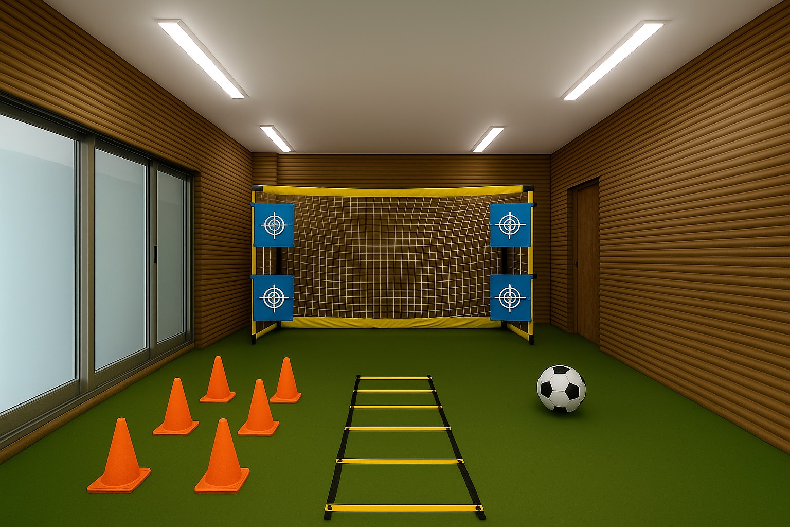 人工芝スペースにゴール・ラダー・マーカー・マット・ボールなどを完備し、天候を気にせず幅広いスポーツを楽しめます。「最大の特徴は、室内に“シュート打ち放題”のサッカーゴールを設置。秘密特訓会場として、今まで味わったことのない新感覚空間をお楽しみいただけます。また、保護者も子どもの練習を見ながら運動・仕事ができるスペースをご用意。施設内にはランニングマシンに加え、デスクワーク用の机と椅子、Wi-Fiを完備し、ご家族全員が満足いただけるプライベート施設となっております。パソコン作業やリモートワークをしながらお子さまの練習を見守れる、これまでにない“親子の新しい時間の使い方”を実現しています。。